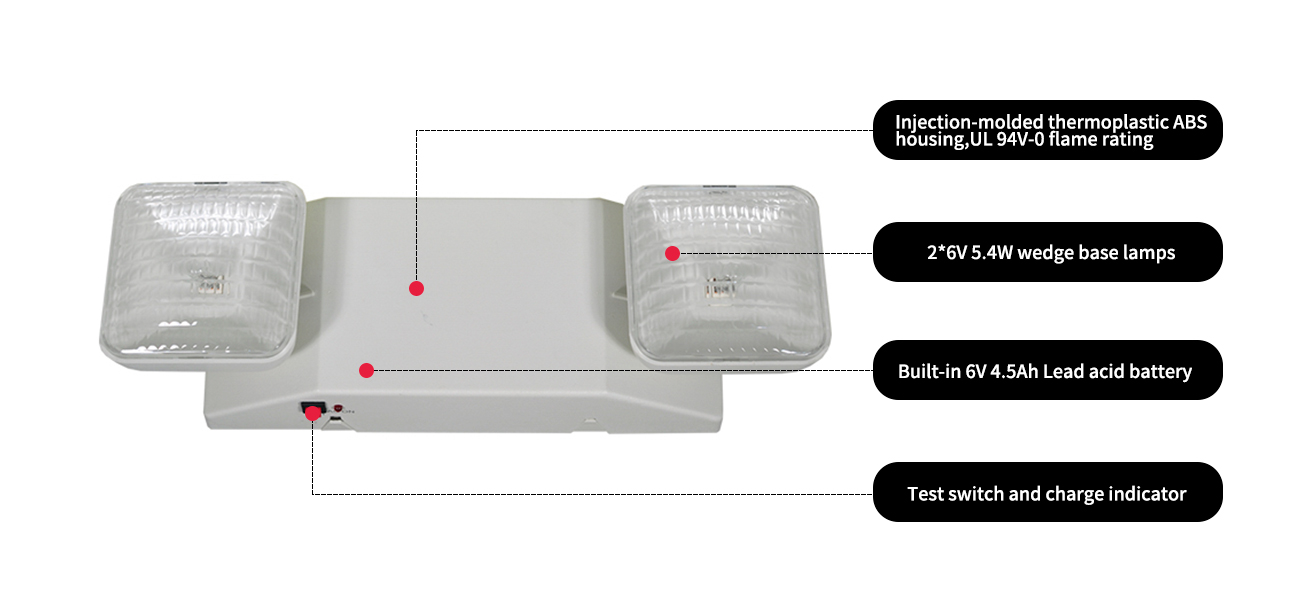 デュアルヘッドの緊急灯 *注入モーレード熱可塑性ABSハウジング、UL 94V-0火炎評価 *数分で革新的で簡単なインストール *ウォールマウントアプリケーションに適しています *ユニバーサルJ-Bo...